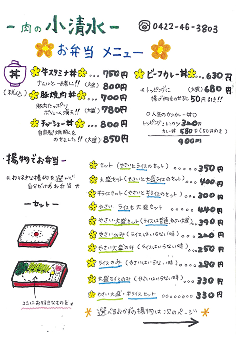 セット(ごはん+野菜)¥350に、お好きな揚げものをトッピングでます。セットの野菜を多く、ごはんを少なくなどもできます。ビーフカレー丼などの丼物もあります。